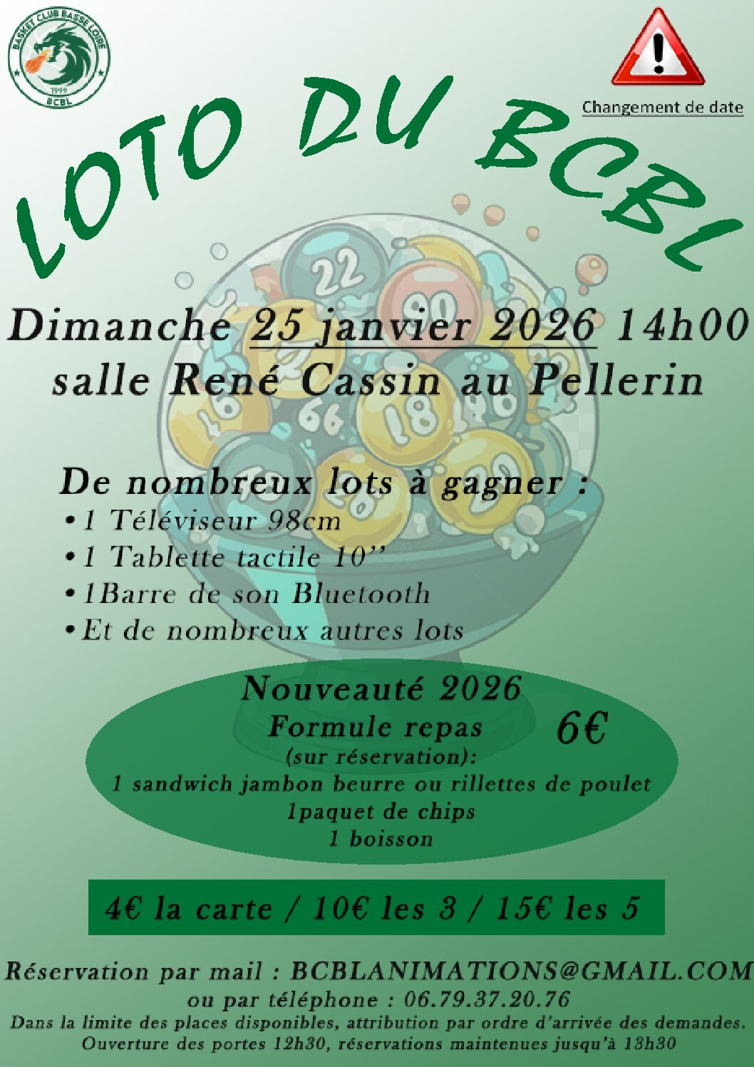 Home Loto du 25/01. Il reste des place, n’hésitez pas à vous inscrire à l’adresse suivante : bcblanimations@gmail.com ou par téléphone au 06.79.37.20.76 — — — Nos Equipes Consulter Matchs du Weekend Consulter Planning Entraînements Consulter Notre Boutique Consulter — Pour nous contacter, utilisez uniquement l’adresse mail suivante : bcbl44@yahoo.fr